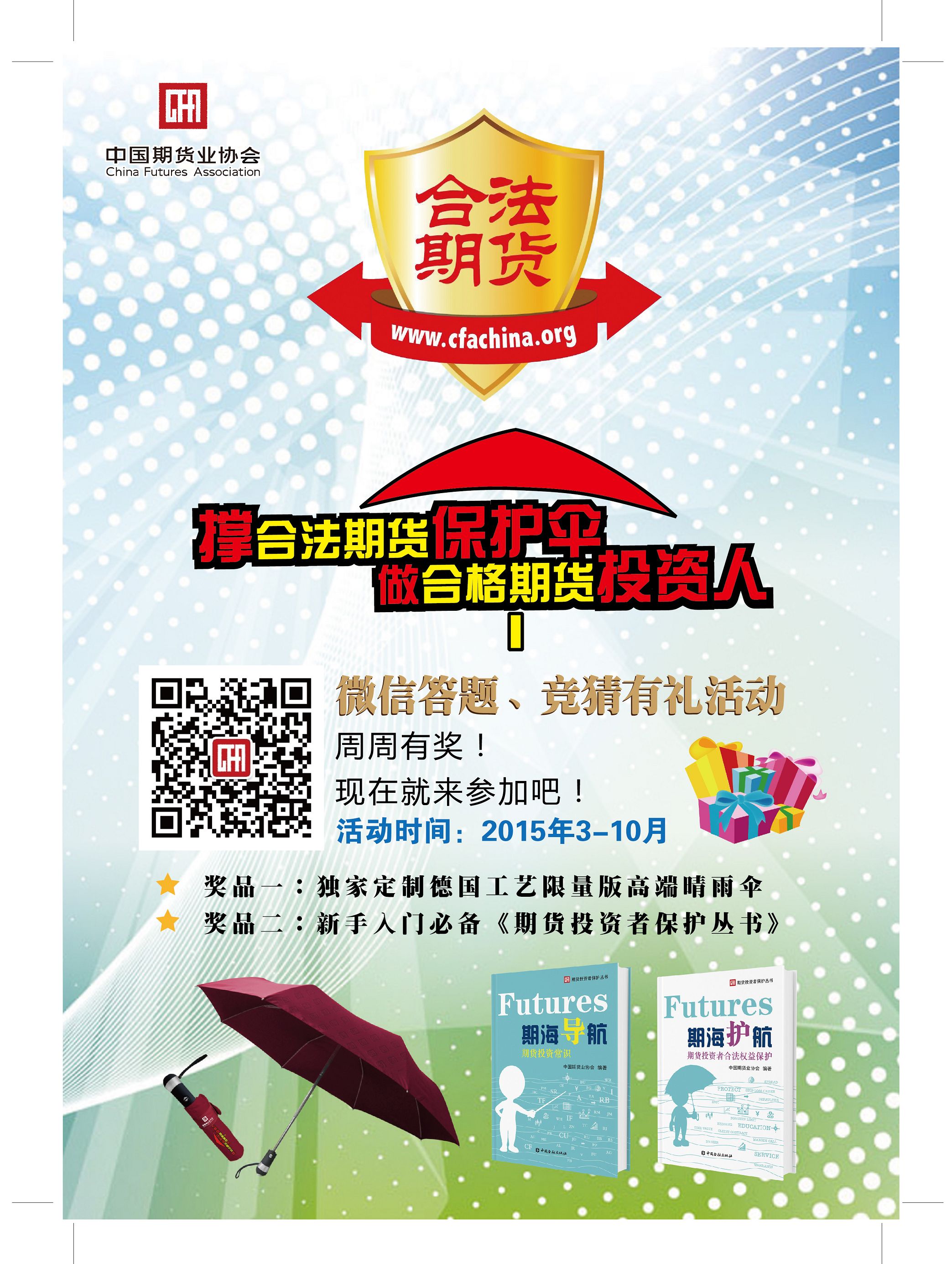 根據(jù)中國(guó)期貨業(yè)協(xié)會(huì)發(fā)布的《關(guān)于開展“撐合法期貨保護(hù)傘、做合格期貨投資人”微信有獎(jiǎng)答題活動(dòng)的通知》,為進(jìn)一步提高投資者保護(hù)意識(shí),推進(jìn)投資者保護(hù)教育活動(dòng),公司組織開展投資者微信有獎(jiǎng)答題活動(dòng)。現(xiàn)就有關(guān)事項(xiàng)通知如下:
