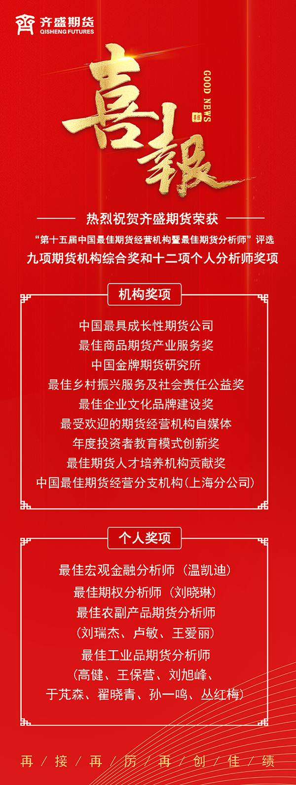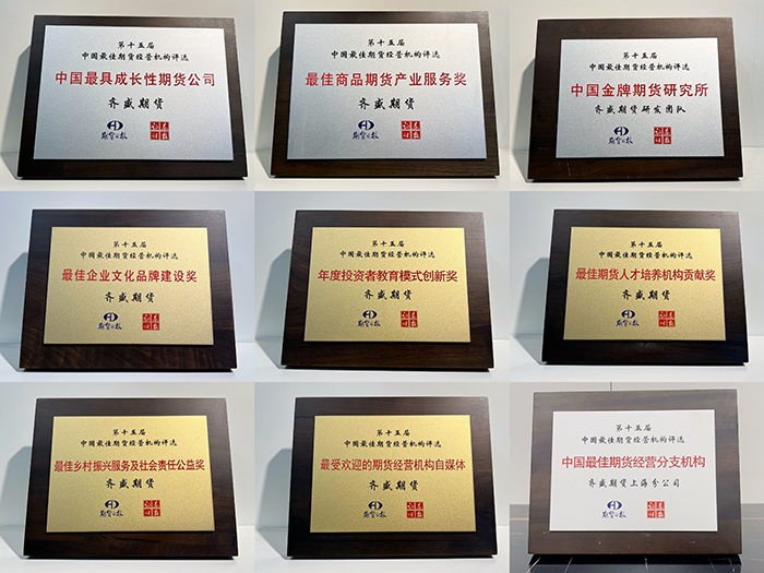 近日,由《證券時報》、《期貨日報》聯(lián)合主辦的“第十五屆中國最佳期貨經(jīng)營機構(gòu)暨最佳期貨分析師評選”活動中,山東齊盛期貨有限公司榮獲“中國最具成長性期貨公司”、“最佳商品期貨產(chǎn)業(yè)服務(wù)獎”、“中國金牌期貨研究所”、“最佳鄉(xiāng)村振興服務(wù)及社會責(zé)任公益獎”等九項期貨機構(gòu)綜合獎和十二項個人分析師獎項。 據(jù)悉,"中國最佳期貨經(jīng)營機構(gòu)暨最佳期貨分析師評選活動"已成功舉辦了十五屆,是國內(nèi)設(shè)立最早、期貨行業(yè)中最具權(quán)威和影響力的評選活動。