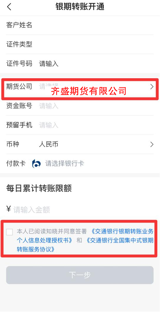 選擇期貨公司、輸入資金賬號等信息,勾選“本人已閱讀“。
