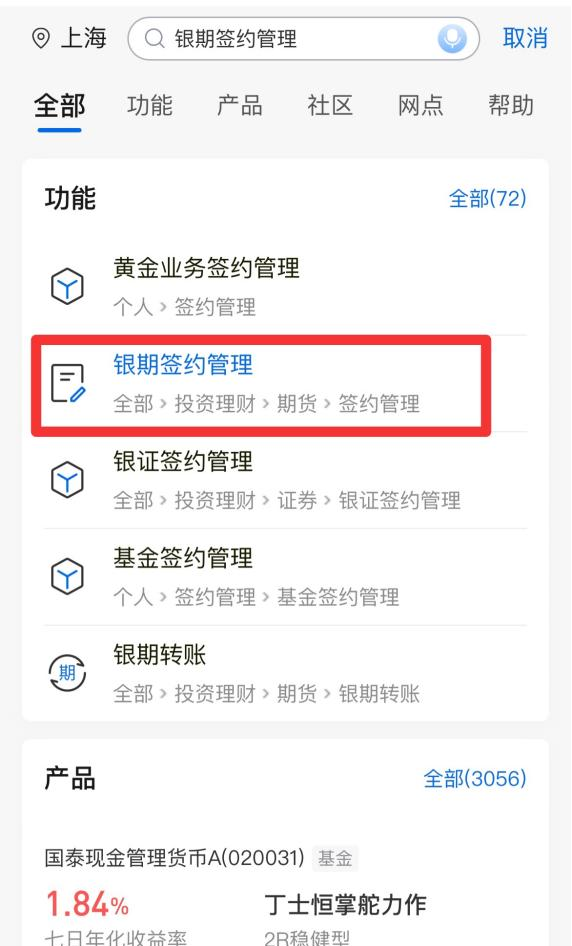 首頁上方搜索欄輸入“銀期簽約管理”。