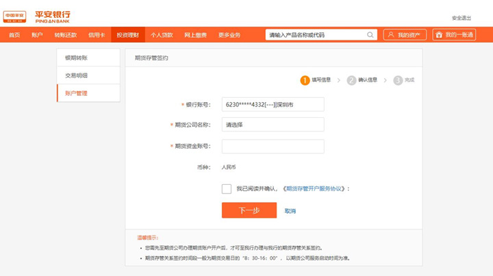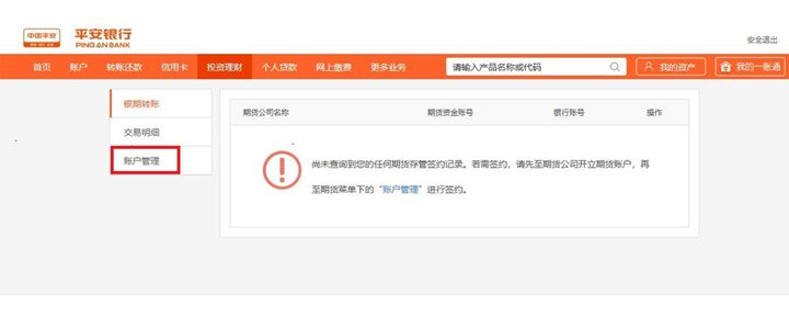 進入銀期業(yè)務界面后,若尚未在期貨公司有關(guān)聯(lián)信息,會有相應提示,您可選擇右側(cè)“賬戶管理“進入簽約界面。