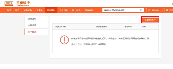 點擊“賬戶管理“,在界面右上方會出現(xiàn)“新增簽約賬戶”菜單,點擊此菜單進入銀期簽約界面。