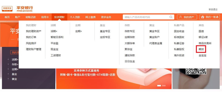 進入網(wǎng)銀后,點擊“投資理財”-“其他“-”期貨“,而后便可進入銀期業(yè)務界面。